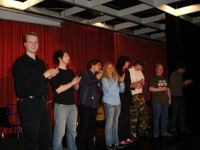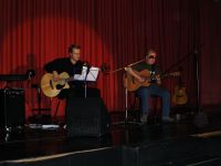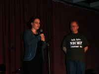 | Schon beim Soundcheck entwickelte sich zwischen uns allen eine Art familiäre Atmosphäre. Selbst unser Sorgenkind, die Monitorbox, fügte sich irgendwann in die neu gebildete Gemeinschaft ein und funktionierte einigermaßen. Fast pünktlich konnten wir anfangen. Der inzwischen als Moderator umgekleidete Kai-Olaf begrüßte alle Anwesenden und leitete durchs Programm und kündigte jeden von uns mit einigen Sätzen an. | ||